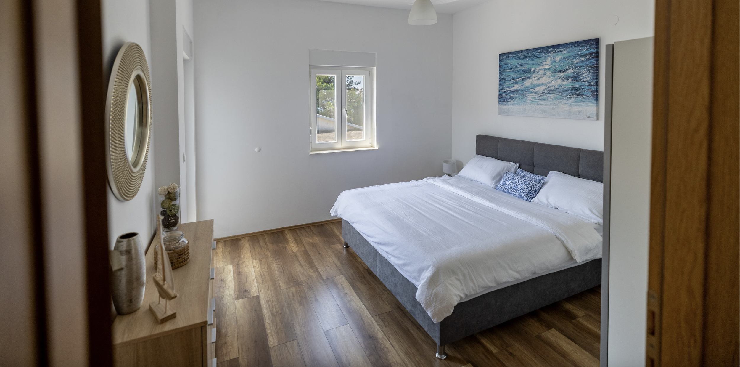 Located on the ground floor with its private enterance, offers 2 spacious bedrooms with high ceilings (5 beds), large bathroom with a laundry machine, living and dining room as well as a fully equipped kitchen. The apartment boosts a beautiful balcony where you can enjoy your morning coffee or an afternoon meal. All rooms are sea oriented so waking up to a sea view is promised. All apartments have flat screen TVs with internet connection to your favorite streaming services, as well as air conditioning units.